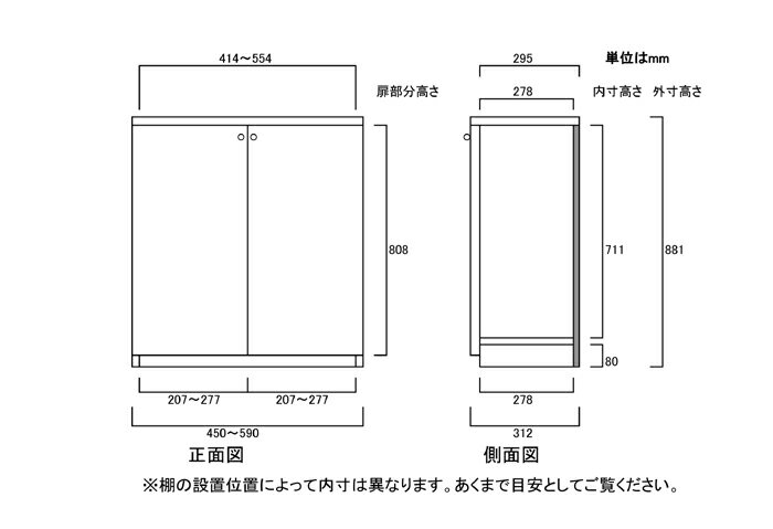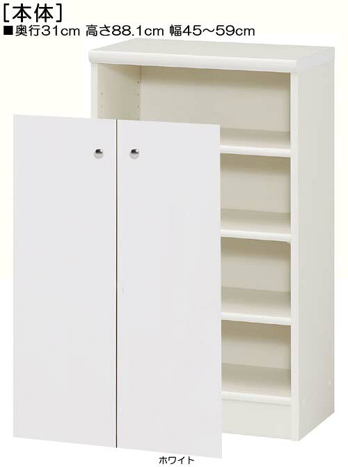商品仕様 ■タイプ: 扉付 標準棚板(棚板厚さ1.7cm)タイプ 両開き ■棚板耐荷重: 10kg ■外寸: 奥行31cm×高さ88.1cm×幅45〜59cm (幅は1cm単位でオーダーできます) ■外寸(幅): 45cm 46cm 47cm 48cm 49cm 50cm 51cm 52cm 53cm 54cm 55cm 56cm 57cm 58cm 59cm ■棚板枚数 移動棚板:2 移動固定棚板:1 共通仕様 ■材質: プリント化粧繊維板 ■塗装: ウレタン樹脂塗装 ■素材: ホルムアルデヒドの発生を最小限に抑えた基材・芯材・プリント紙・接着剤(F☆