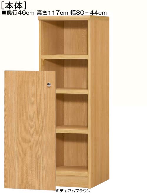 商品仕様 ■タイプ: 扉付 タフ棚板(棚板厚さ2.5cm)タイプ 片開き ■棚板耐荷重: 30kg ■外寸: 奥行46cm×高さ117cm×幅30〜44cm (幅は1cm単位でオーダーできます) ■外寸(幅): 30cm 31cm 32cm 33cm 34cm 35cm 36cm 37cm 38cm 39cm 40cm 41cm 42cm 43cm 44cm ■扉高(実寸): 80.8cm ■棚板枚数 移動固定棚板:3 共通仕様 ■材質: プリント化粧繊維板 ■塗装: ウレタン樹脂塗装 ■素材: ホルムアルデヒドの発生を最小限に抑えた基材・芯材・プリント紙・接着剤(F☆