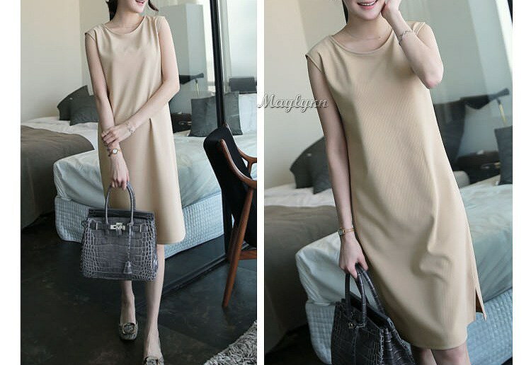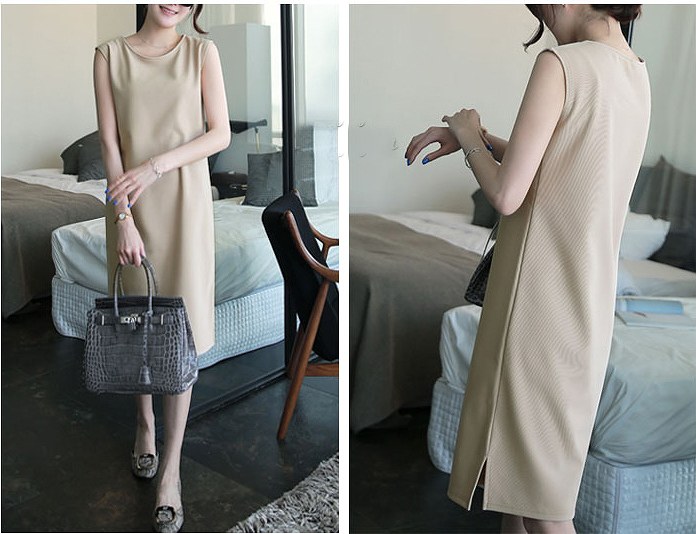 ノースリーブワンピース 無地 膝丈 上品 大人 ベージュ ブラック 大きいサイズ有り S〜XXL(2L)ゆうパケット発送可